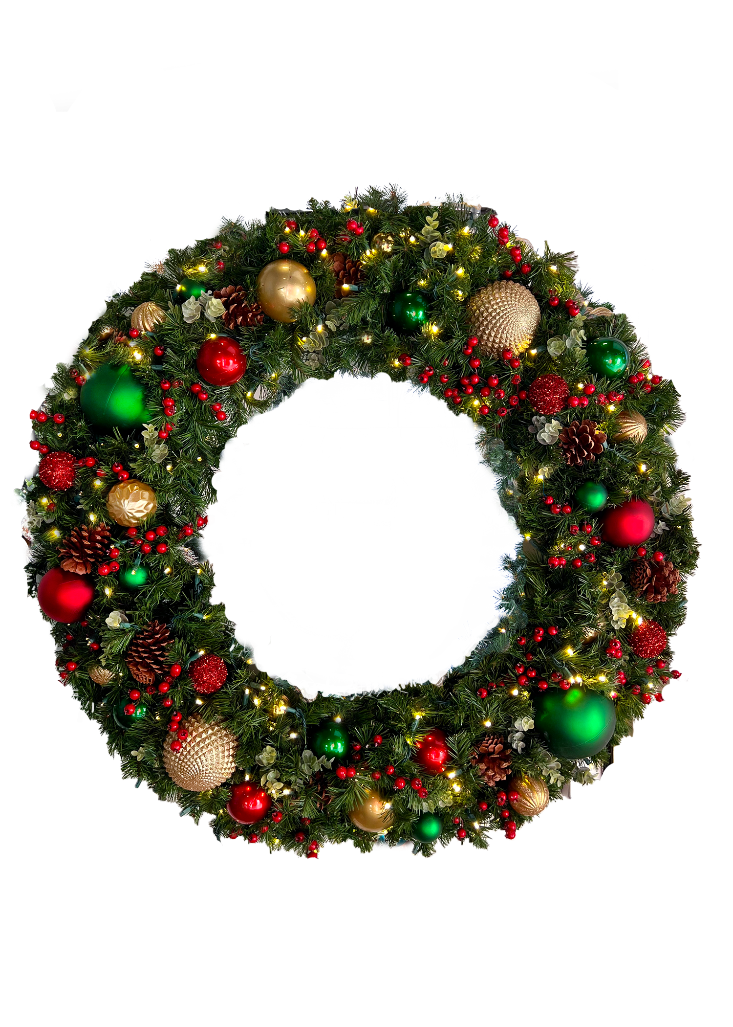 These wreaths are constructed with the finest materials in the industry and pre wrapped with high quality warm white outdoor 5mm LED mini lights. These are built to last outdoors, and come with pre-installed ornamental designer touches to set your Christmas display apart from the rest.