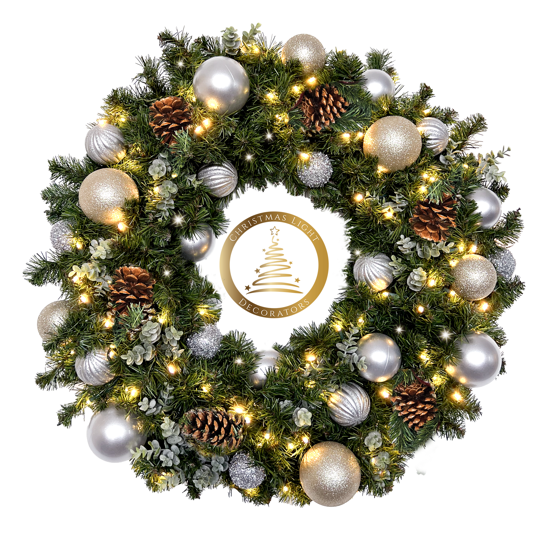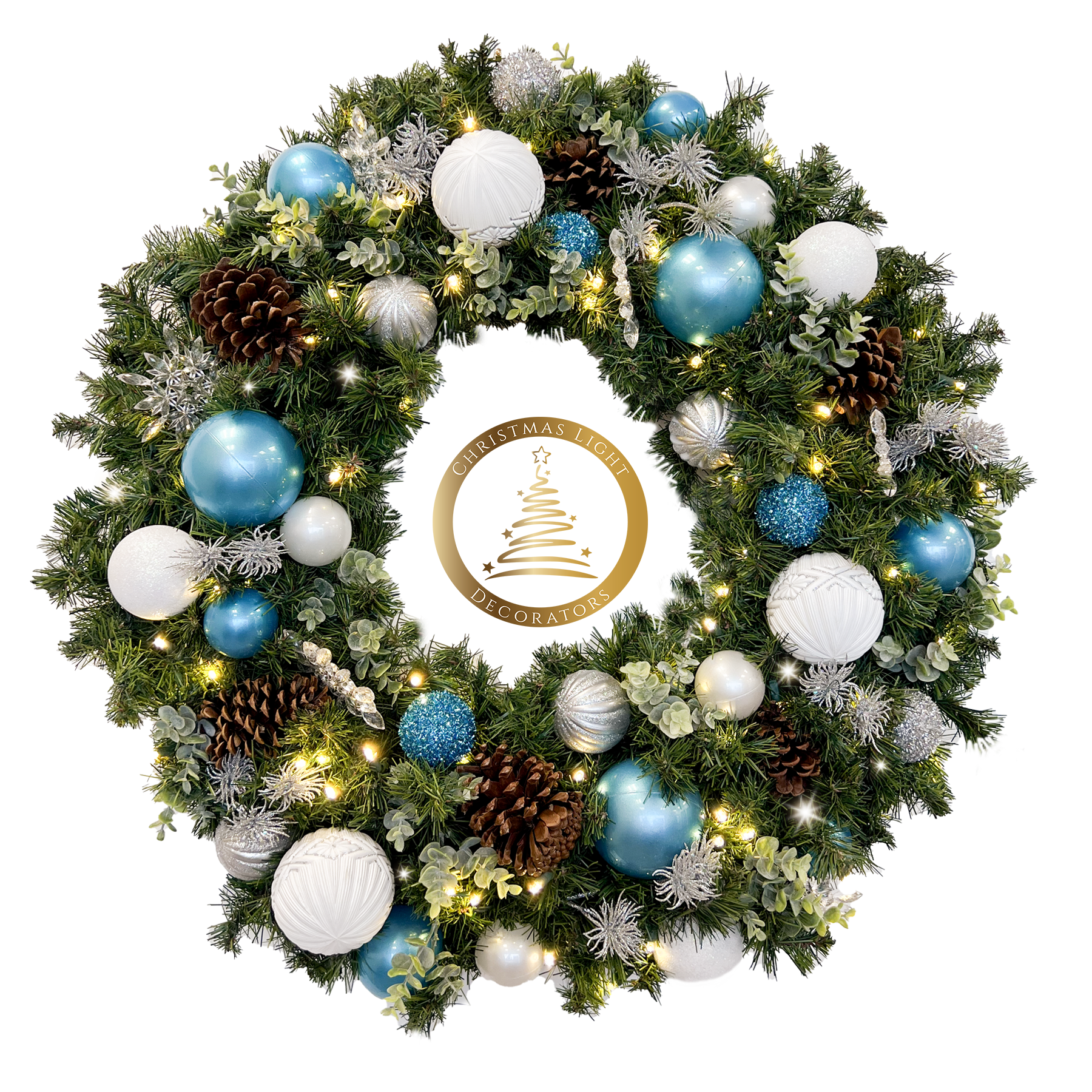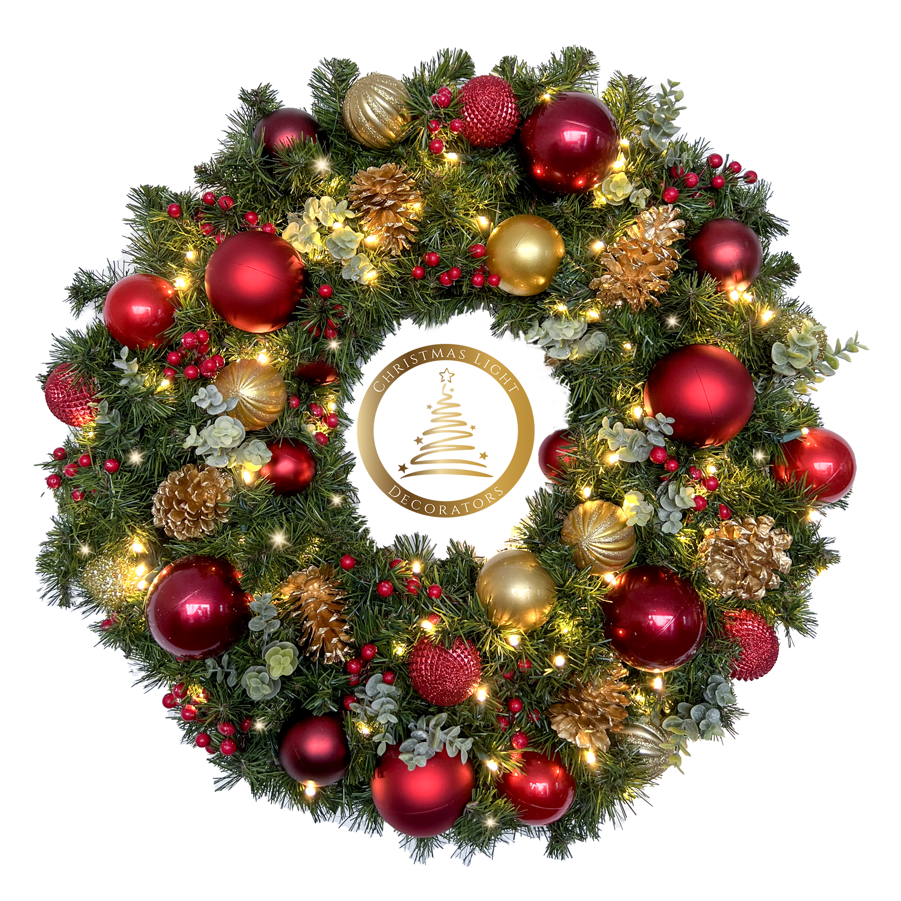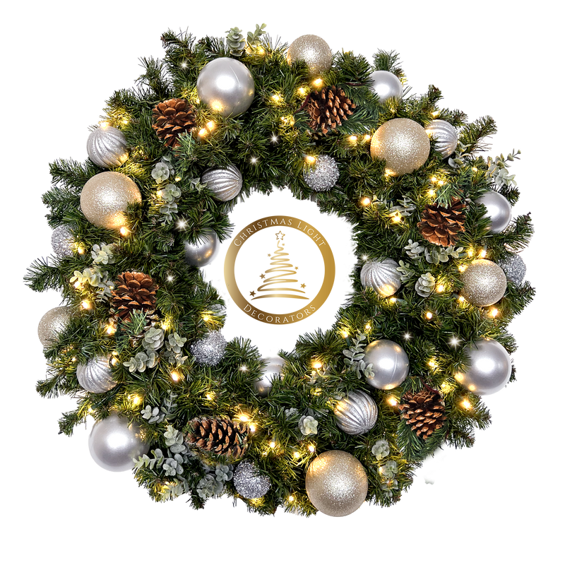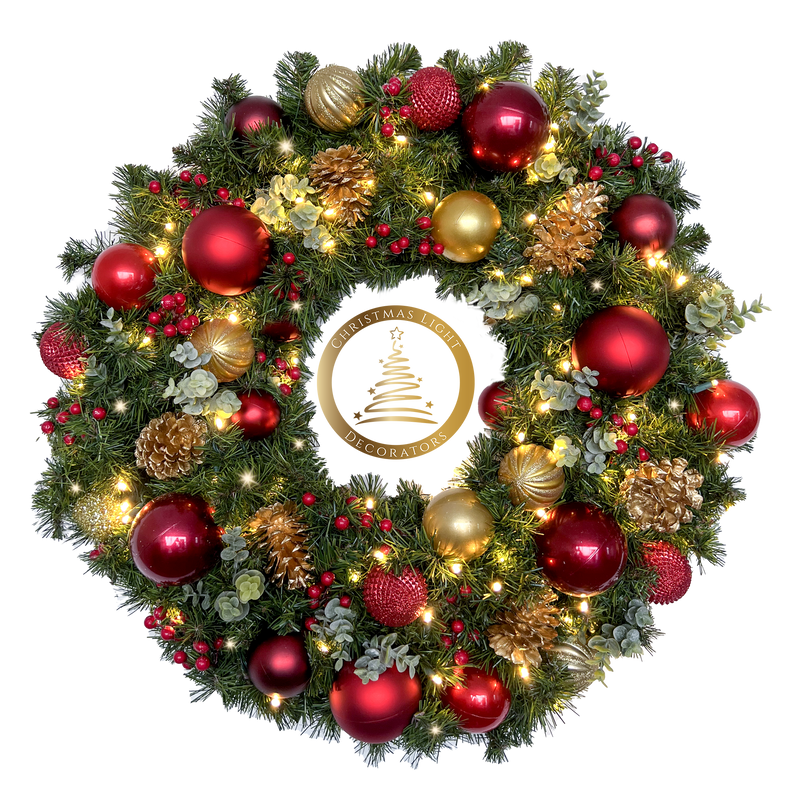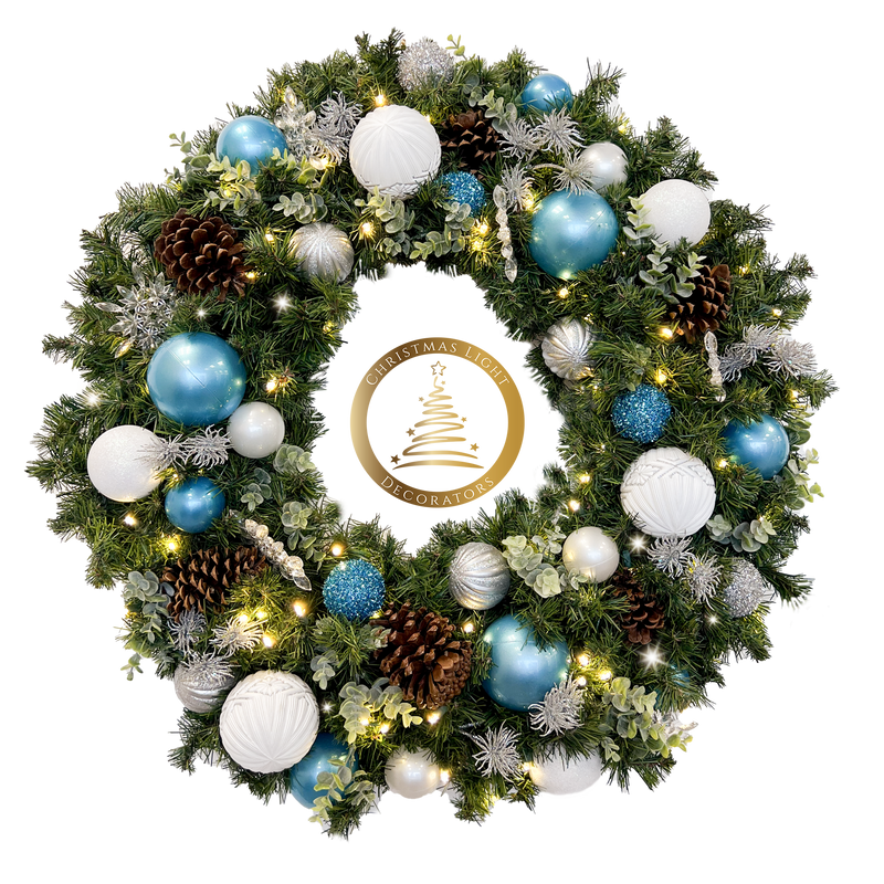 Stunning designer wreaths constructed by Christmas Light Decorators (CLD). The soft glow of warm white lights will add an old fashioned flair to your Christmas!