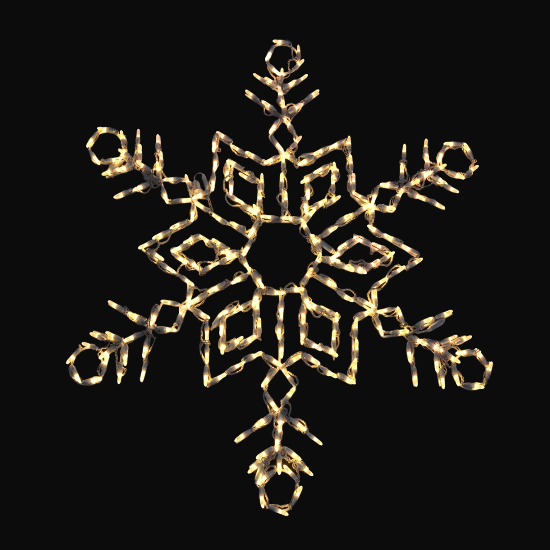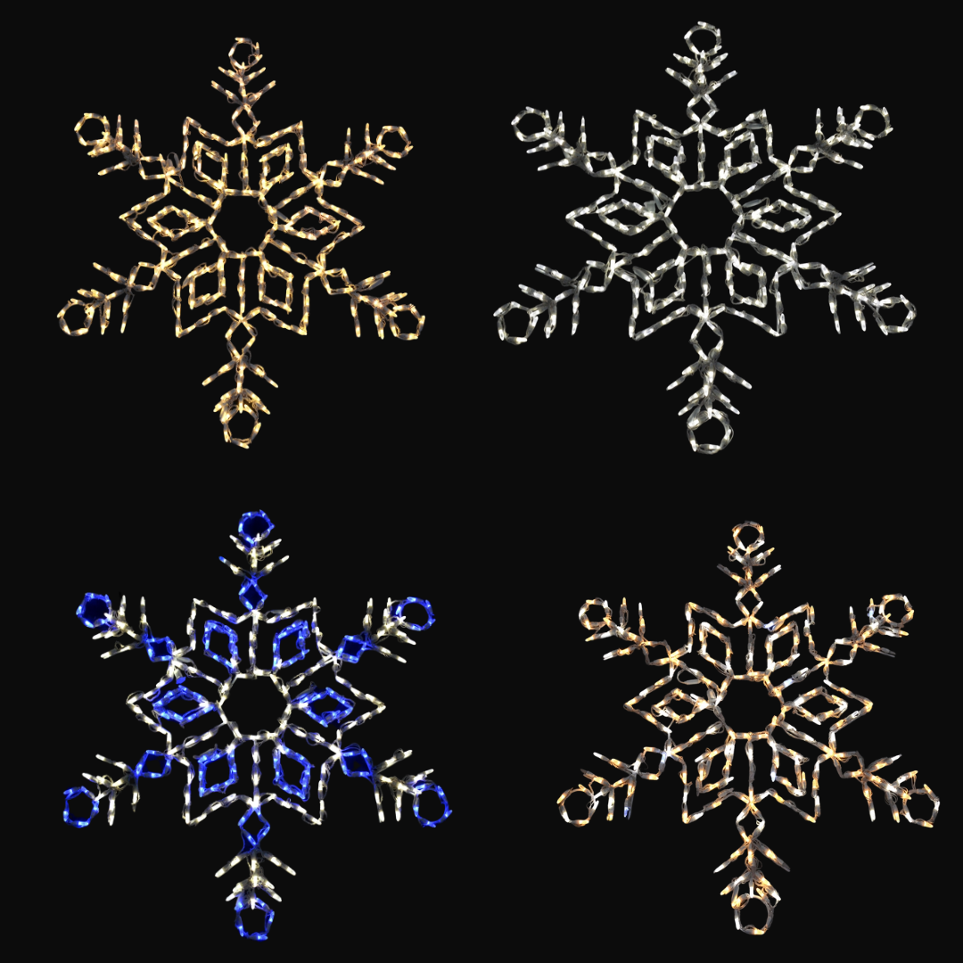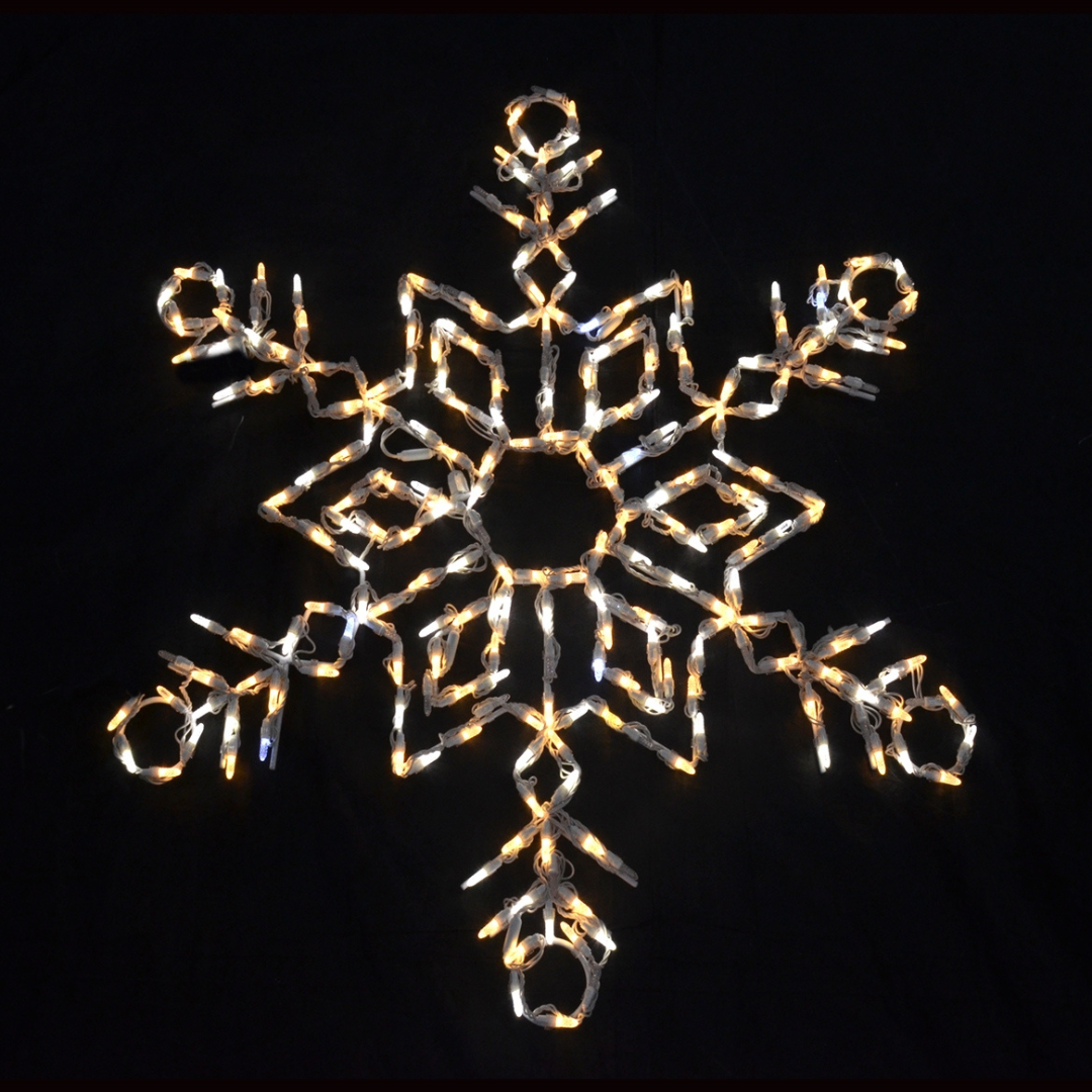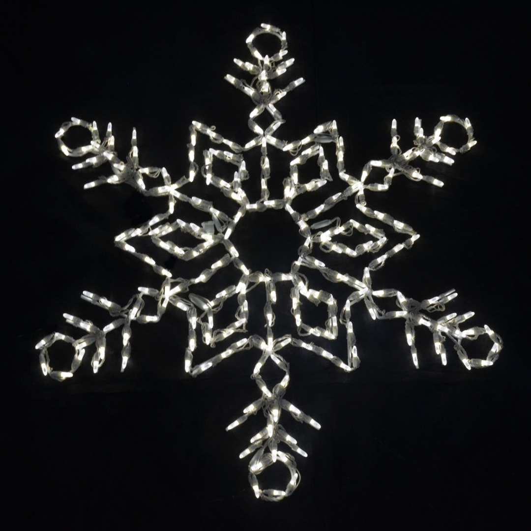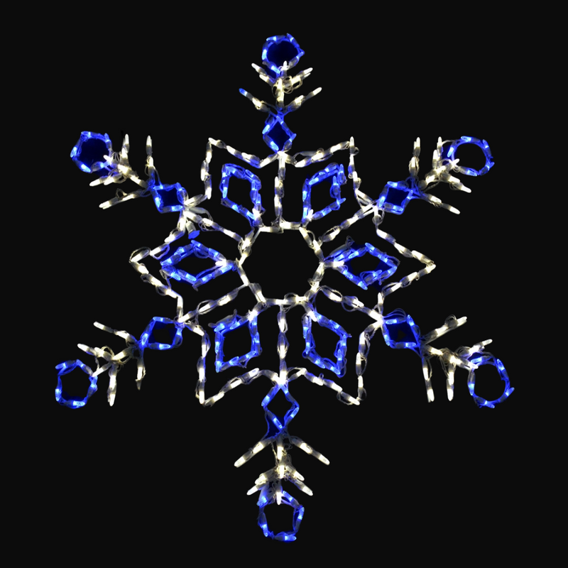 This metal wire frame showpiece can be installed in trees, on a wall, or virtually anywhere you please. The open eye holes at the ends of the snow crystal allows for an attachment to be used when hanging the snow crystal from a suspended area. HBL is known for some of the best quality and long lasting mini lights in the industry. These 42" snow crystals come with 251 LED mini lights.
