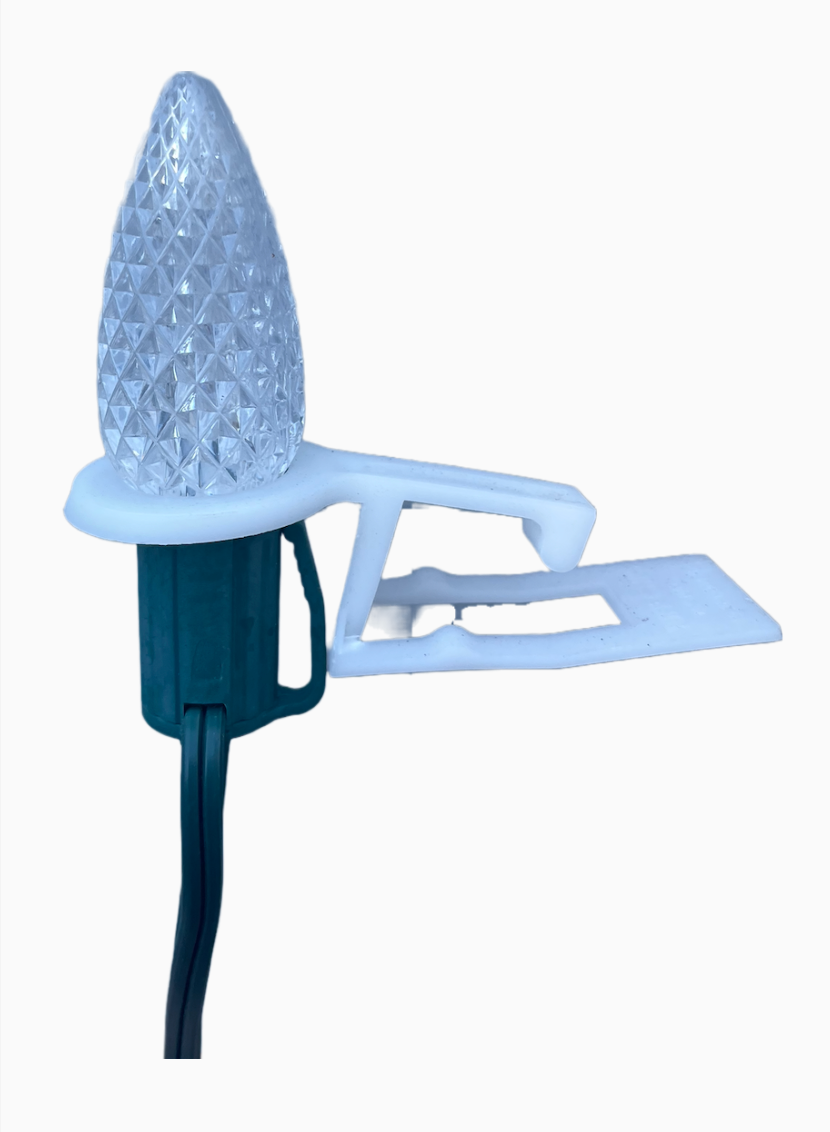 Made of durable plastic, the TuffClip is designed to withstand the wear and tear of installation, take-down and harsh weather. The “sandwich style” gutter clip has a 360-degree rotating fastener, which eliminates the hassle of power direction during installation. Once assembled, the TuffClip stays attached to the light socket and can easily be stored until next season. Unlike other clips, the TuffClip does not fall apart and stays with the lights, preventing any clips from being lost or left behind.